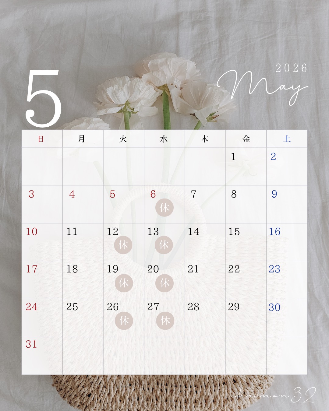 5月の営業日は、下記カレンダーの通りです。