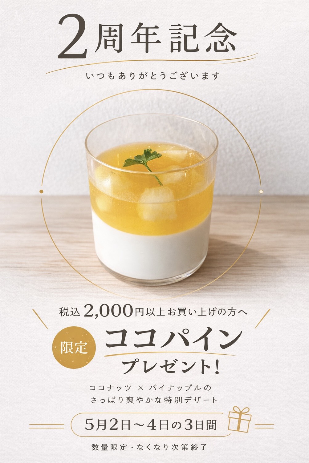 2周年記念の限定デザート 「ココパイン」 をプレゼントいたします。